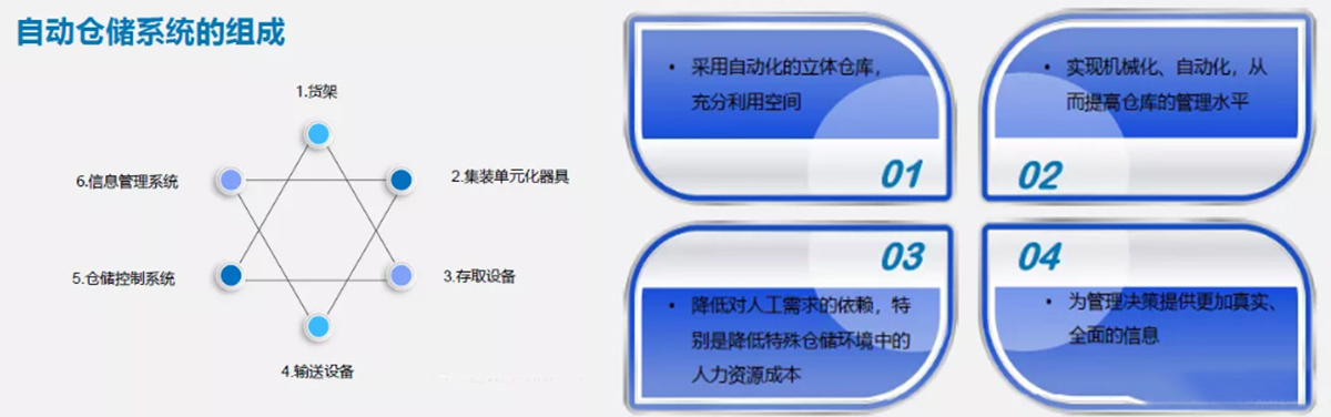 自動倉儲系統初期多指自動化立體倉庫,如今已遠遠超過了之前的范疇。從廣義上來講自動倉儲系統還包括可對單元貨物實現自動化裝卸車、自動化拆碼垛、自動化存取,以及可以實現自動化分揀、自動化包裝等功能,并進行自動控制和信息管理的倉儲系統。